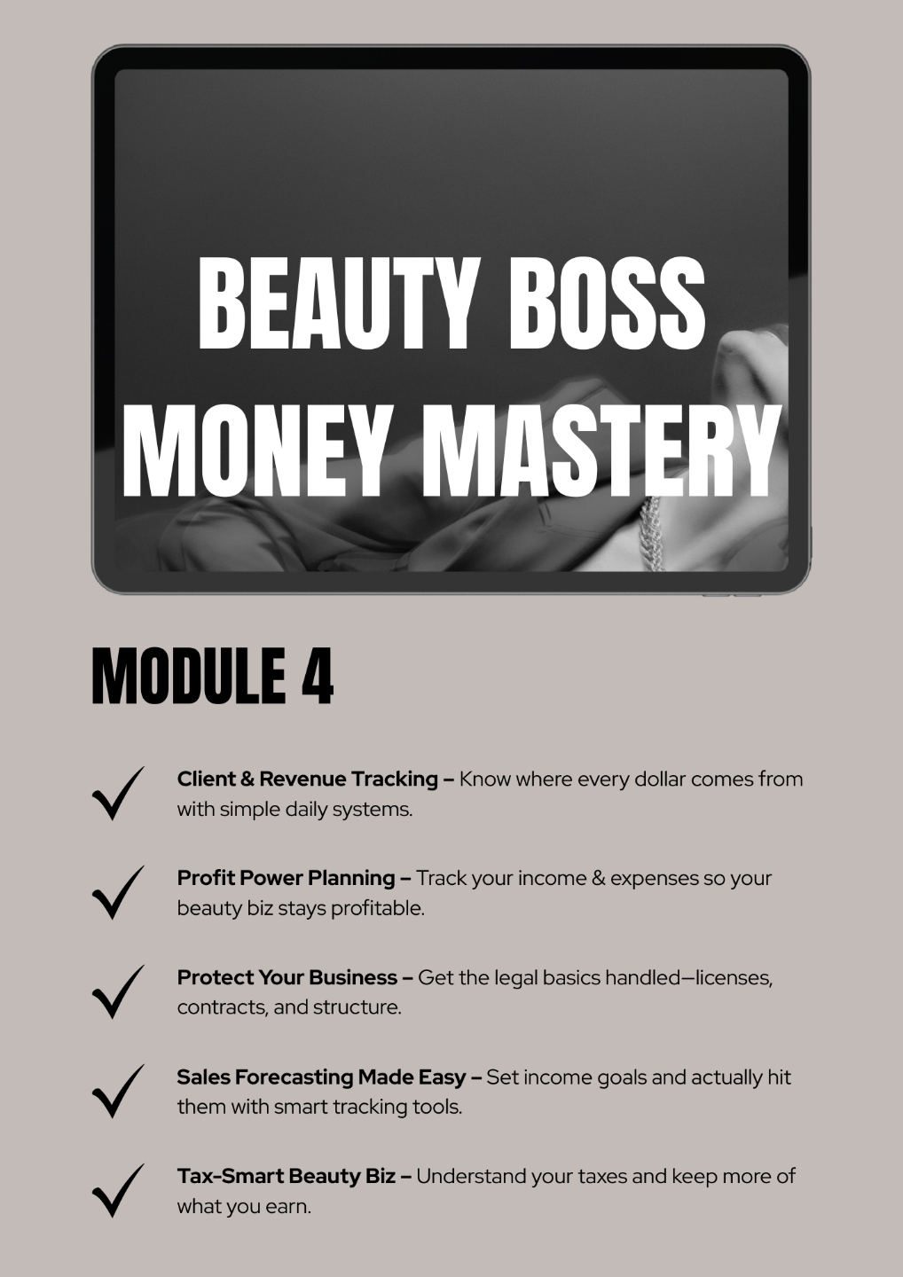 This module helps you take control of your finances, protect your income, and grow a beauty business thatās built to last.